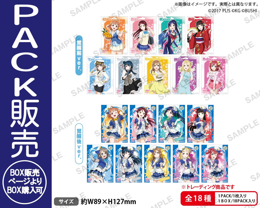 「ラブライブ!スクールアイドルフェスティバル」より、覚醒前と覚醒後のイラストを使用したAqoursのトレーディングブロマイド 初期ver.が登場!18種のうち、覚醒後イラストを使用した9種は統一型の箔押し仕様です!